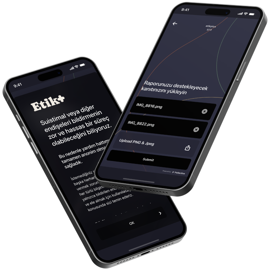 Yetkilileri yanlış davranışlar veya diğer konular hakkında bilgilendirmenin hassas ve zorlu bir prosedür olabileceğinin farkındayız. Bu nedenle, Etik Plus formlarının kesinlikle anonim olmasını sağladık – kişi istemediği sürece – adını veya başka herhangi bir kişisel bilgisini açıklaması gerekmez.